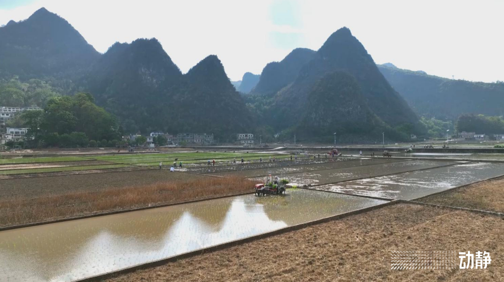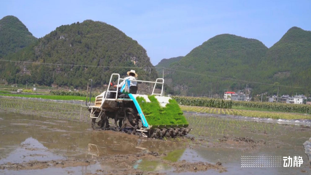 走进兴义市义龙新区德卧镇毛杉树村的水田里,伴随着插秧机来回穿梭,一排排嫩绿的秧苗被整齐划一地插入田中。