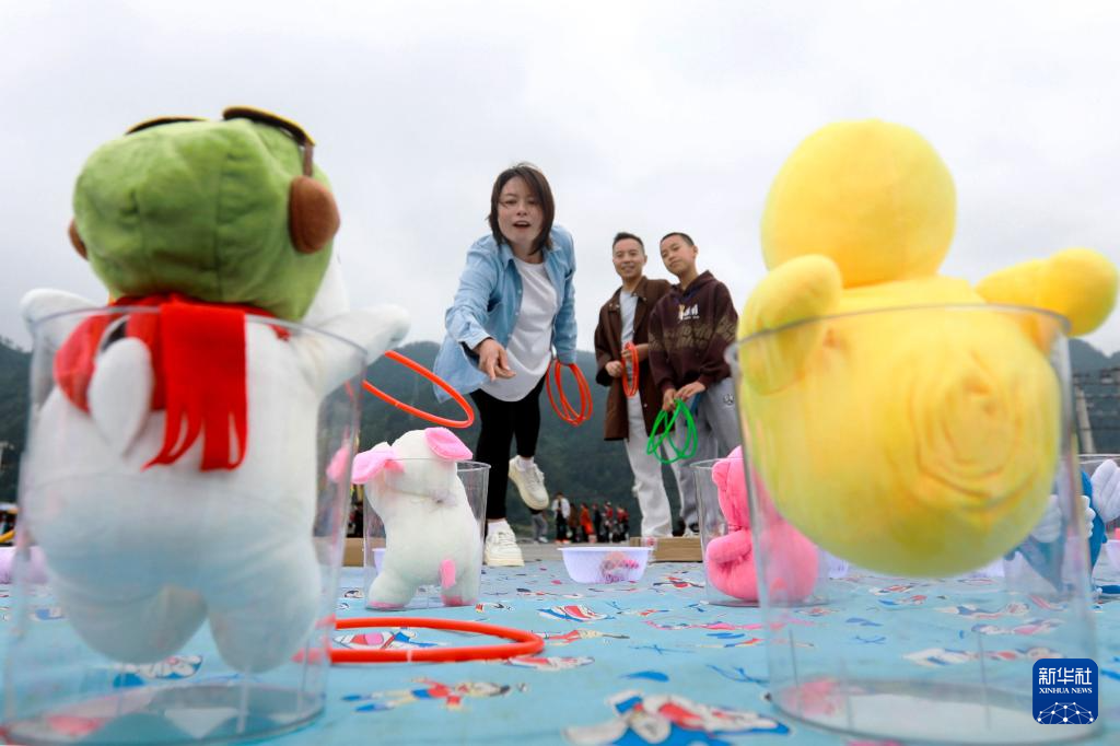 5月1日,游客在贵州省剑河县仰阿莎文化广场参加趣味游戏活动。新华社发(万文杰摄)