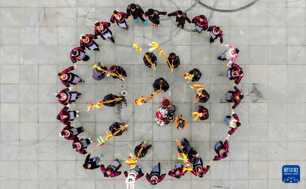 5月1日,苗族群众在贵州省剑河县仰阿莎文化广场跳芦笙舞(无人机照片)。