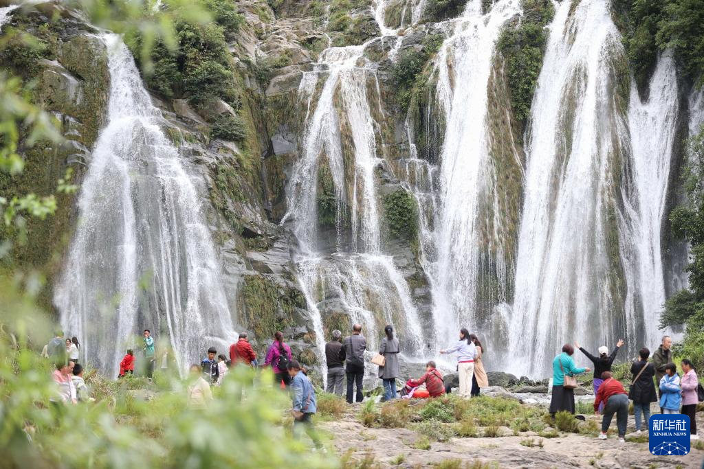 5月1日,游客在贵州省丹寨县龙泉镇排廷村瀑布观赏游玩。新华社发(杨武魁摄)