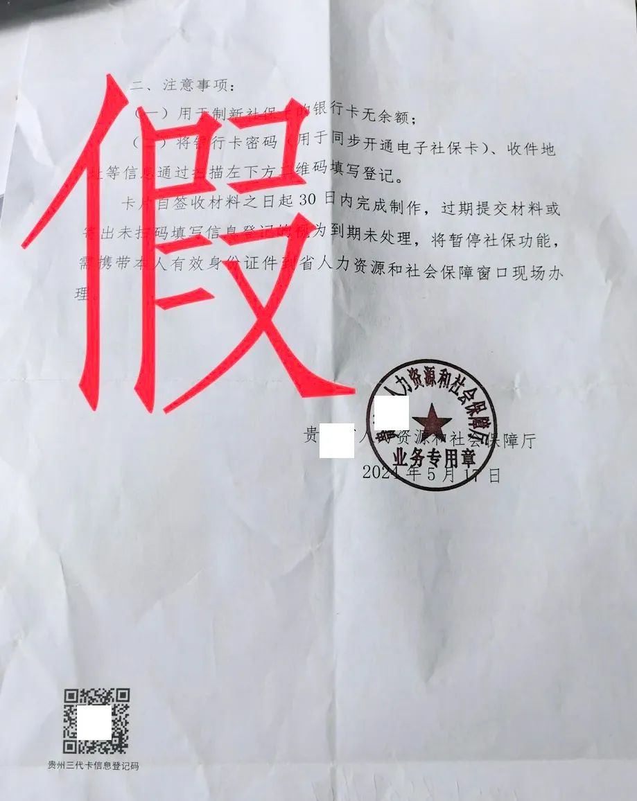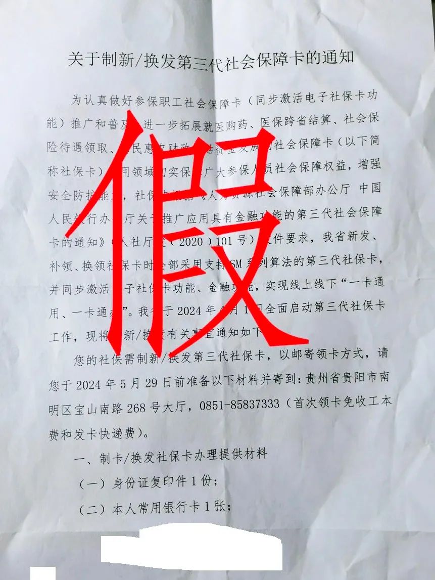 伪造公函,并以《关于制新/换发第三代社会保障卡的通知》名义,要求群众向特定地址邮寄身份证、银行卡复印件,同时要求扫描伪造文件中的二维码,通过登录小程序填写个人银行卡号及交易密码。
