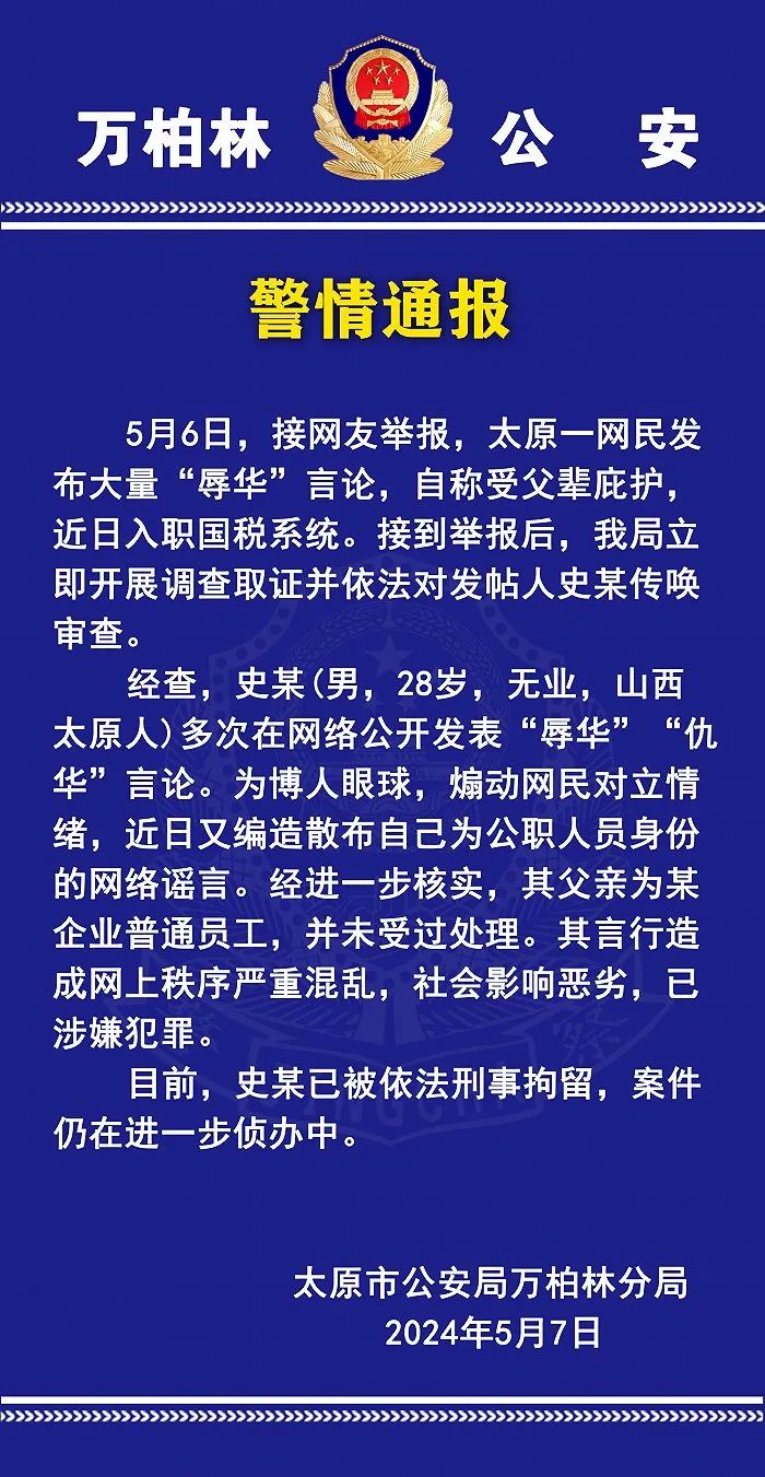 山西太原市公安局万柏林分局5月7日发布警情通报,5月6日,接网友举报,太原一网民发布大量“辱华”言论,自称受父辈庇护,近日入职国税系统。接到举报后,该局立即开展调查取证并依法对发帖人史某传唤审查。