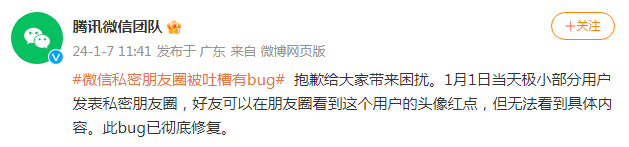 1月7日,针对“微信私密朋友圈被吐槽有bug”,腾讯微信团队官方回复: