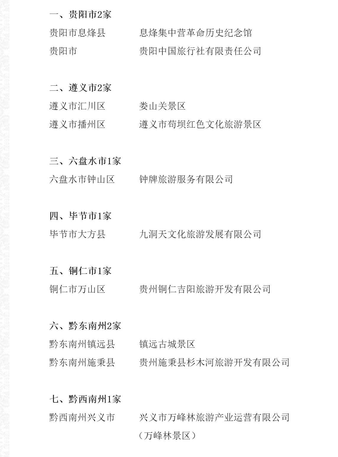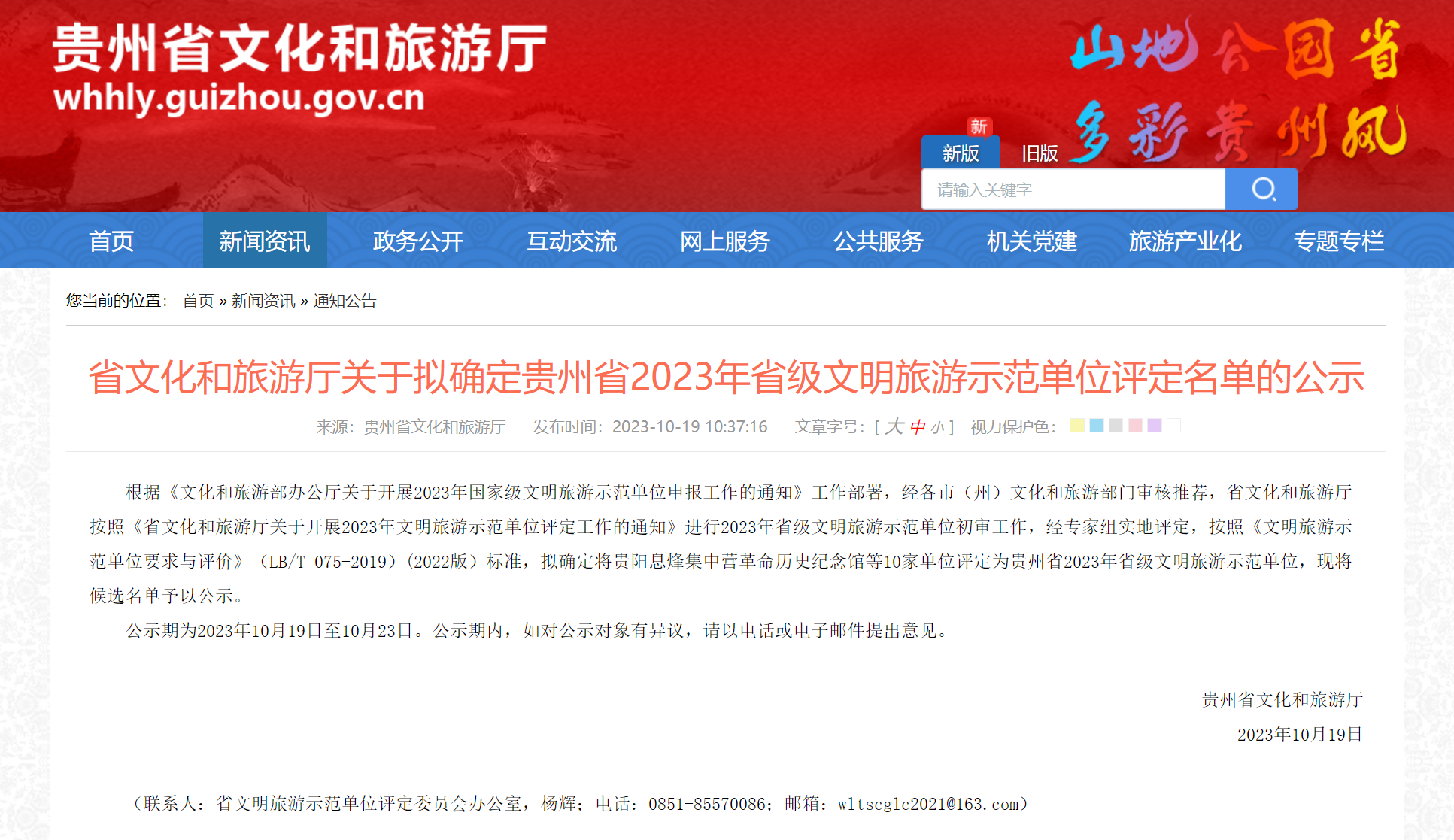 10月19日,省文化和旅游厅发布公示,拟确定将贵阳息烽集中营革命历史纪念馆、娄山关景区等10家单位评定为贵州省2023年省级文明旅游示范单位。