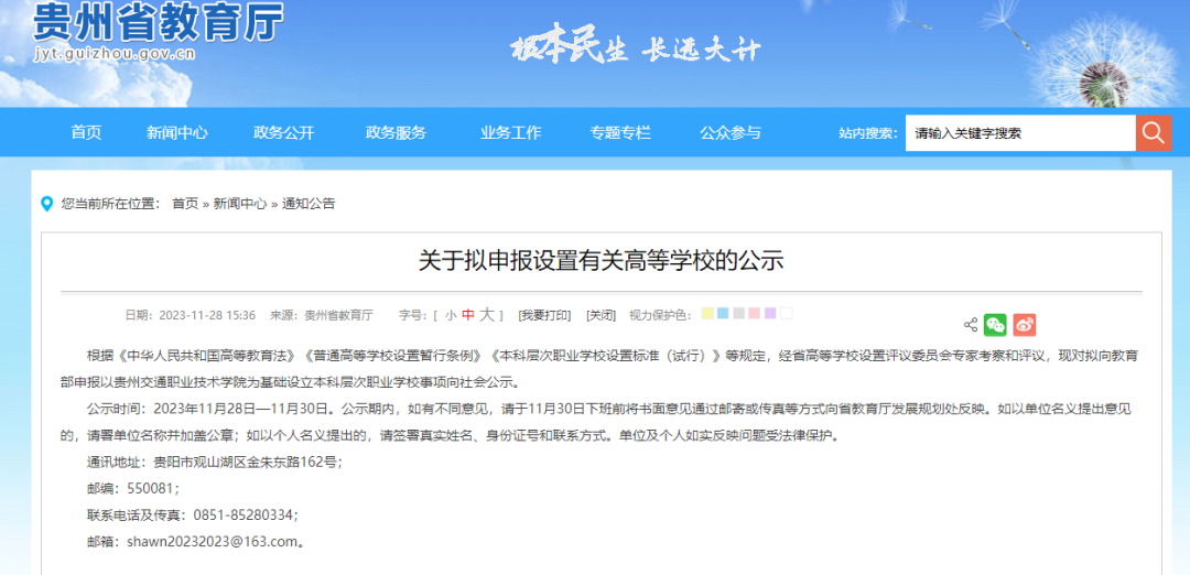 根据《中华人民共和国高等教育法》《普通高等学校设置暂行条例》《本科层次职业学校设置标准(试行)》等规定,经省高等学校设置评议委员会专家考察和评议,现对拟向教育部申报以贵州交通职业技术学院为基础设立本科层次职业学校事项向社会公示。