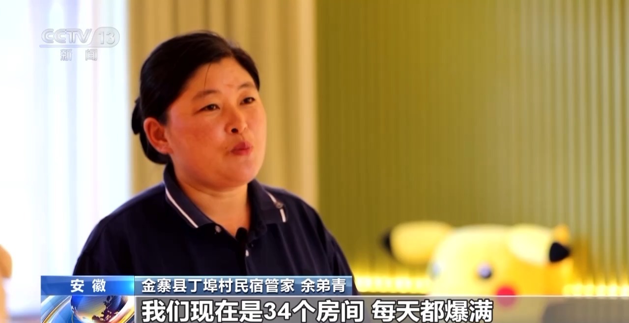 安徽省金寨县丁埠村民宿管家 余弟青:我们现在是34个房间,每天都爆满。每天过得很开心,现在每月有三千块钱了,还有福利。