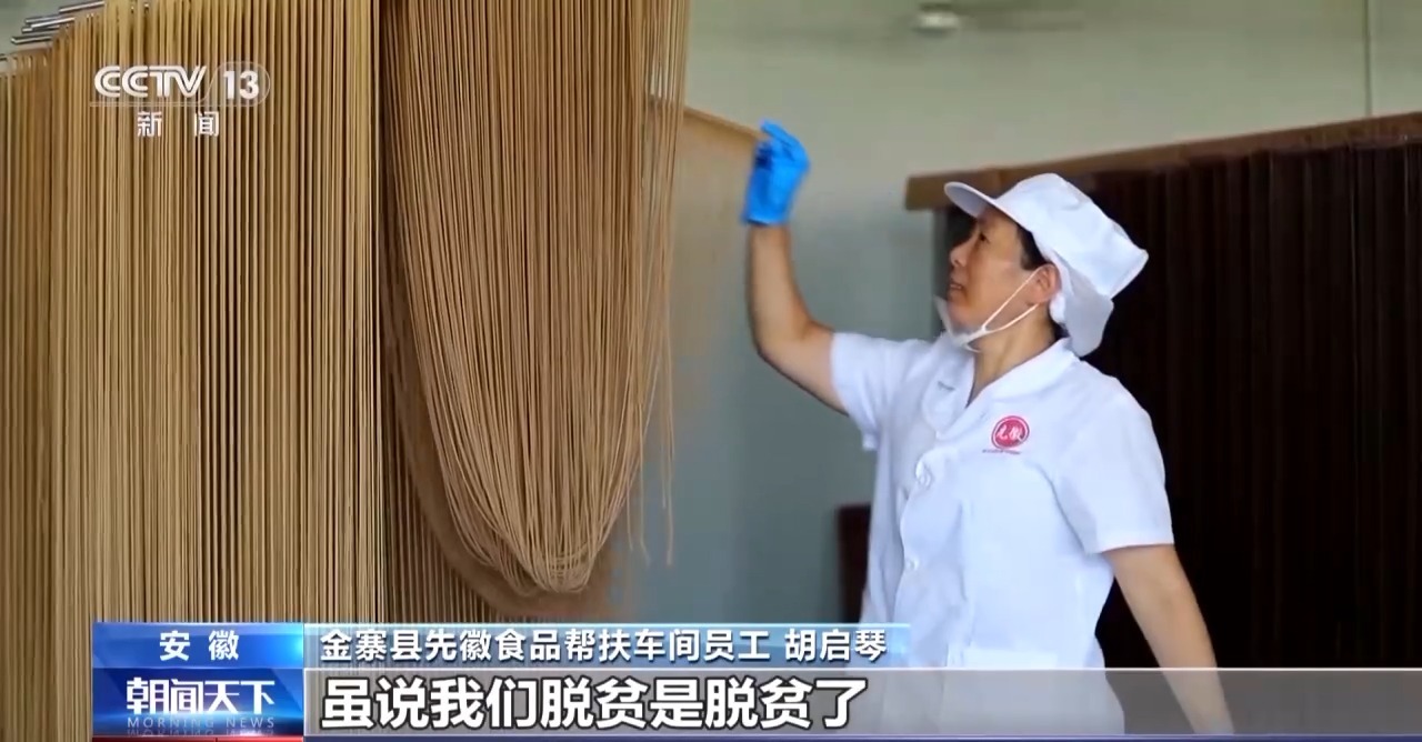 在金寨开发区这个食品加工厂的帮扶车间,工人们正在生产手工挂面。胡启琴在帮扶车间里已经干了两年多,她告诉记者,如今,不仅有稳定的收入,8小时工作之外还能照顾家,心里很踏实。
