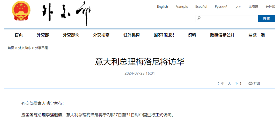 应国务院总理李强邀请,意大利总理梅洛尼将于7月27日至31日对中国进行正式访问。
