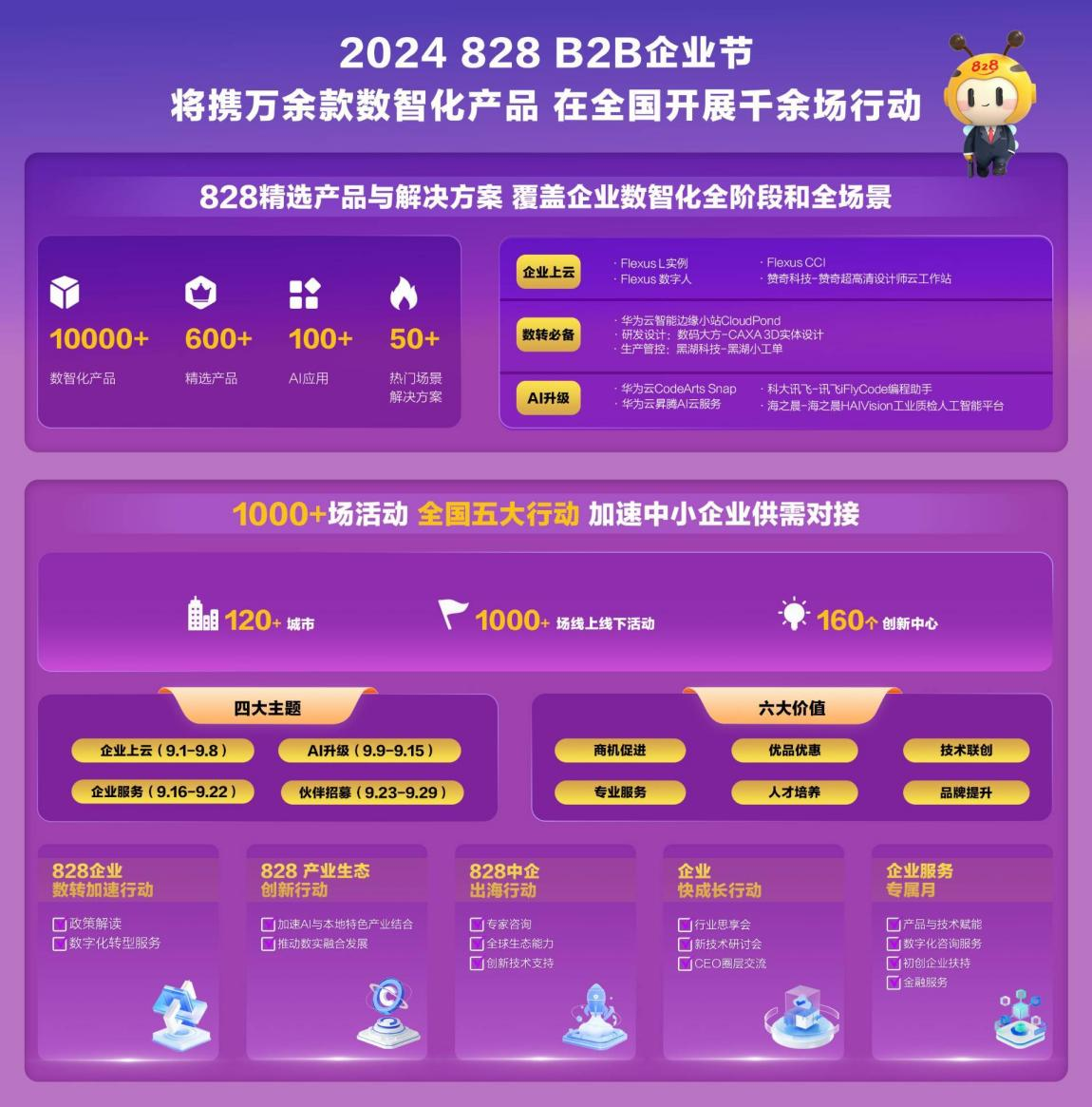 未来一个月,828 B2B企业节将在全国范围内开展1000多场线上线下行动,包括企业数转加速、产业生态创新、中企出海等五大行动,促进数智化供需双方的充分对接。同时,华为和伙伴还将为企业提供数字化咨询服务、金融服务、人才培训计划等多重服务,加速企业成长,并在华为云官网和云商店推出更多优惠政策,助力企业轻松上云、用云。