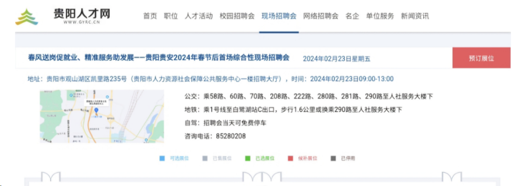 有招人意向的用人单位可登录贵阳人才网“春风送岗促就业、精准服务助发展—贵阳贵安2024年春节后首场综合性现场招聘会”专栏预定展位,活动现场最多可容纳108家企业入驻。