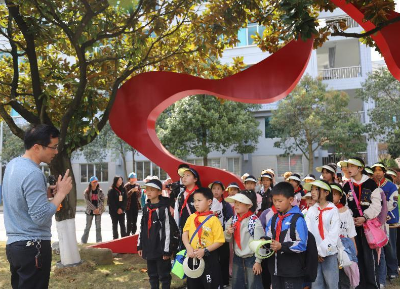 在黔南民族师范学院五星思政广场,黔南民族师范学院马克思主义学院戴建国教授给孩子们讲解党史和红船精神。