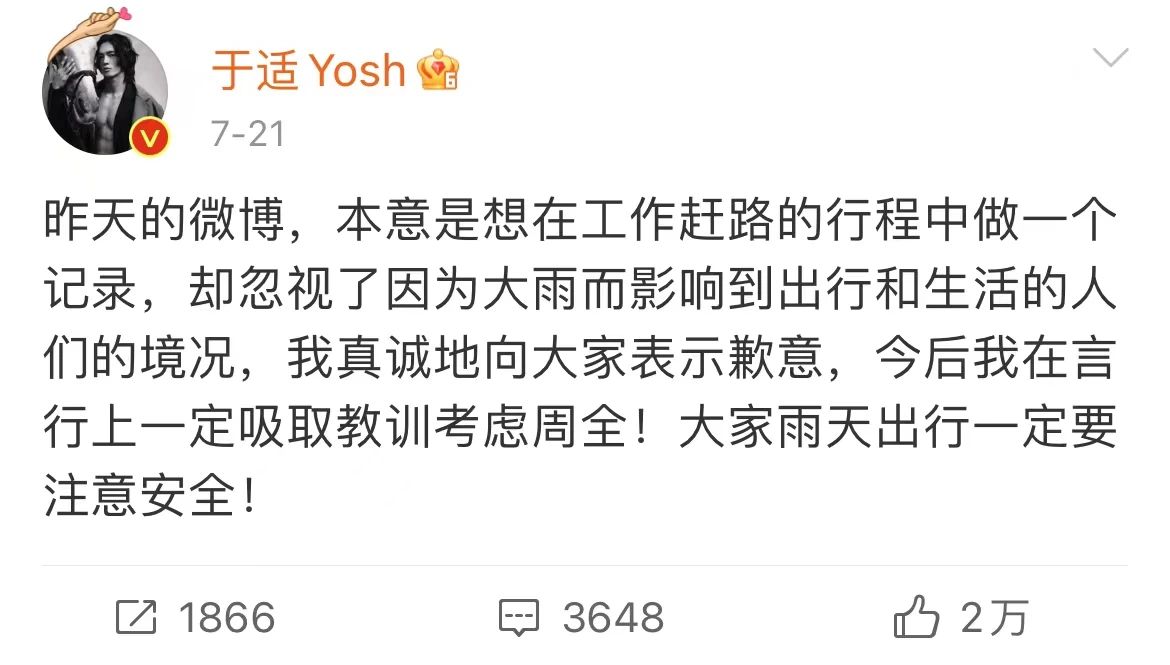 于适后发布微博道歉称,“昨天的微博,本意是想在工作赶路的行程中做一个记录,却忽视了因为大雨而影响到出行和生活的人们的境况,我真诚地向大家表示歉意,今后我在言行上一定吸取教训考虑周全!大家雨天出行一定要注意安全!”