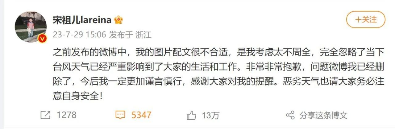 下午3点06分,宋祖儿发微博道歉称,图片配文很不合适,考虑太不周全,完全忽略了当下台风天气已经严重影响到了大家的生活和工作。她表示非常抱歉,并承诺今后一定更加谨言慎行。