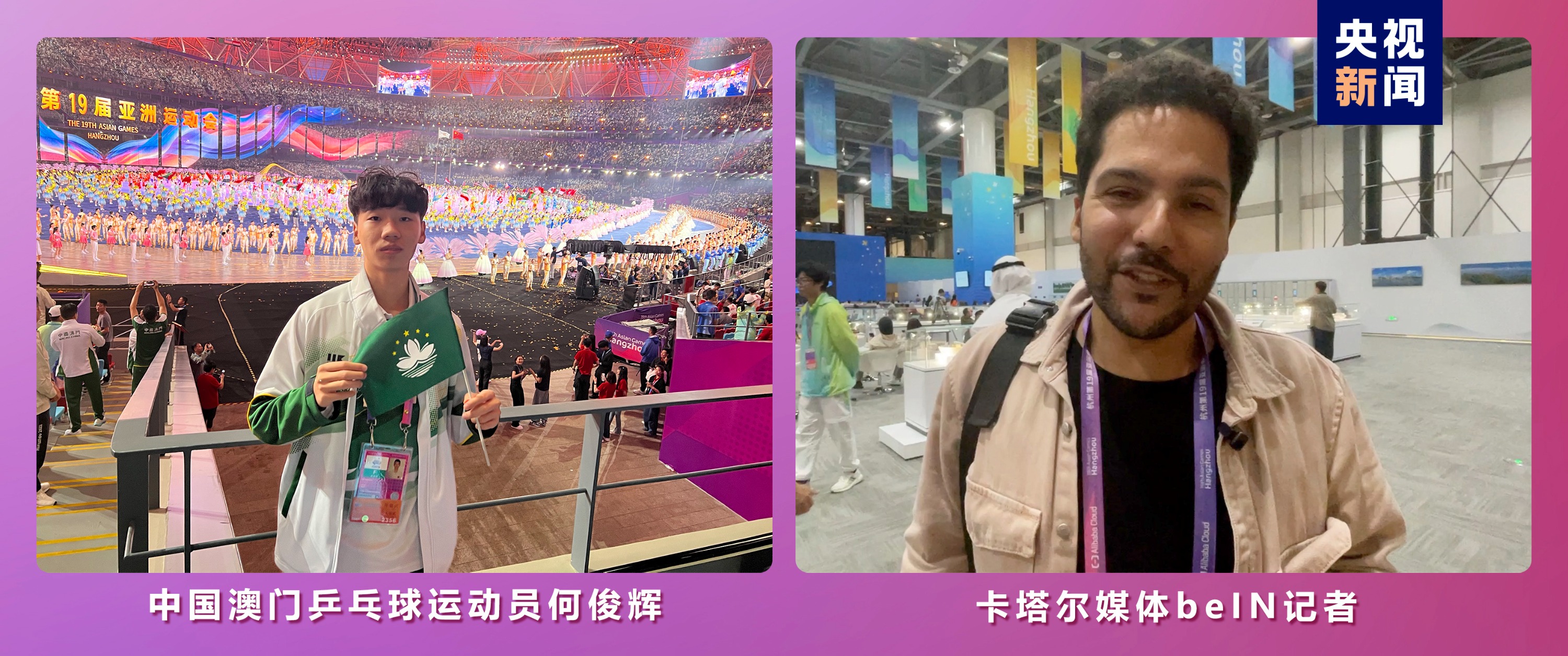中国澳门乒乓球运动员何俊辉说,这次亚运会开幕式好精彩,节目表演和点火炬的场面非常震撼,特别是我们中国澳门代表团入场时,现场的观众都很支持我们,特别开心!