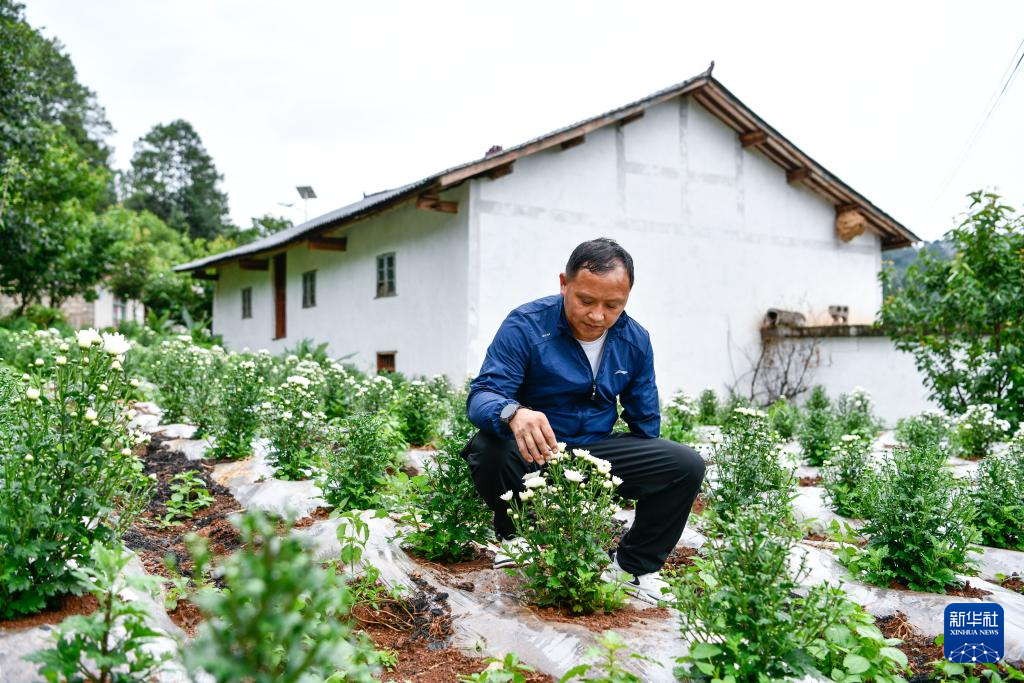 朱大清在地里查看自己种植的药用菊花(7月19日摄)。新华社记者 杨文斌 摄