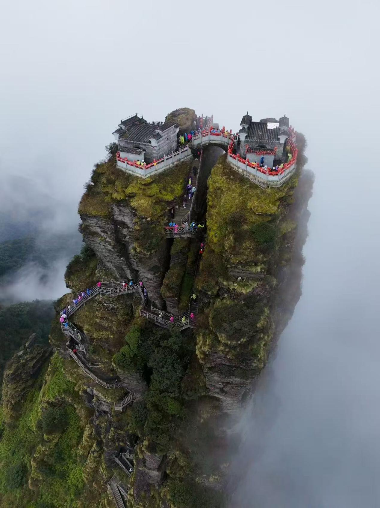 11月12日,采访团一行前往铜仁梵净山,体验了攀登金顶和蘑菇石的非凡之旅。梵净山的金顶,以其独特的造型和险峻的地势,吸引了所有人的目光。这座高达数百米的山峰,矗立在狭窄的山脊之上,被风化出了一道狭缝,一分为二,形成了两座孤峰,中间由一座天桥连接,状若飞龙。这种独特的自然景观,让每一位到访者都感受到了大自然的神奇力量,感受梵净山世界自然遗产魅力。