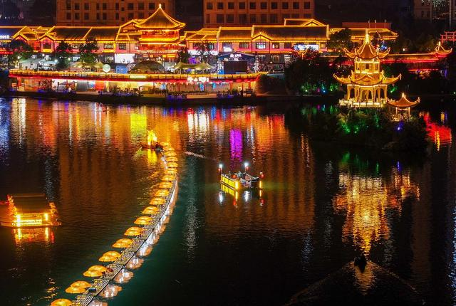 在铜仁中南门古城,采访团成员乘坐独具铜仁本土文化特色的龙船夜游锦江。长龙竹筏缓缓驶离码头,宛如一条“火龙”在锦江河面穿梭而过。这由 30 个竹筏组成的特色游船,在夜色中格外耀眼。坐在船上,微风拂面,令人心旷神怡。