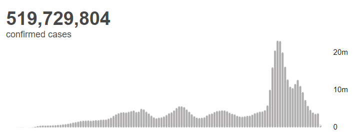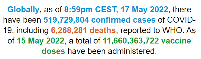 根据世卫组织最新实时统计数据,截至欧洲中部夏令时间5月17日20时59分(北京时间5月18日2时59分),全球累计新冠肺炎确诊病例519729804例,累计死亡病例6268281例;17日全球新冠肺炎确诊病例新增346558例,死亡病例新增900例。
