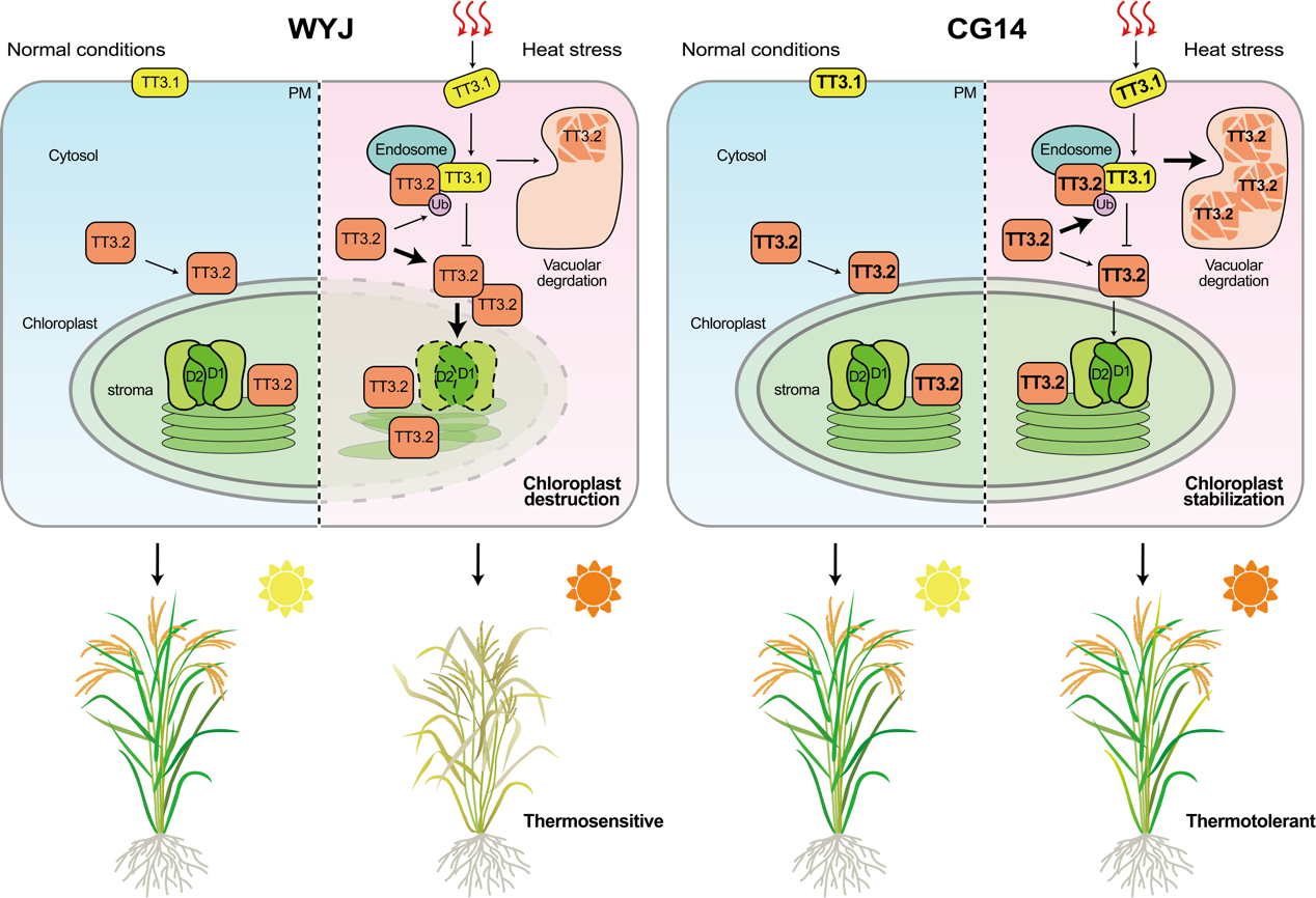随着全球气候变暖趋势的加剧,高温胁迫成为制约世界粮食生产安全的最为主要的胁迫因子之一。据报道,平均气温每升高1℃,会造成水稻、小麦、玉米等粮食作物3%~8%左右的减产。因此挖掘高温抗性基因资源、阐明高温抗性分子机制以及培育抗高温作物新品种成为当前亟待攻克的重大课题。研究团队经过近十年的努力,终于成功分离克隆了水稻高温抗性新基因位点TT3,并且阐明了其调控高温抗性的新机制。这是研究团队继TT1和TT2之后,取得的又一重大进展。