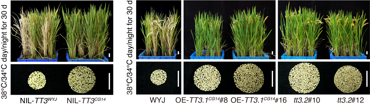 借助分子生物技术方法将该研究发掘的抗高温新基因TT3.1/TT3.2应用于水稻、小麦、玉米、大豆以及蔬菜等作物的抗高温育种改良中,提高不同作物品种的高温抗性,维持其在极端高温下的产量稳定性,对于有效应对全球气候变暖引发的粮食安全问题具有重要意义。