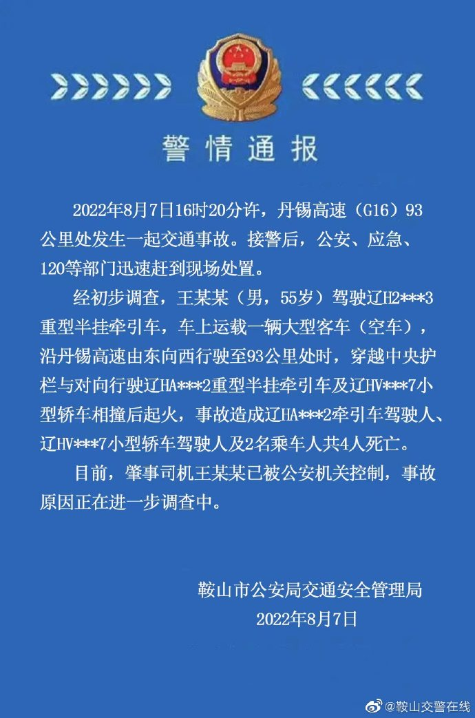 8月7日晚,@鞍山交警在线 发布警情通报: