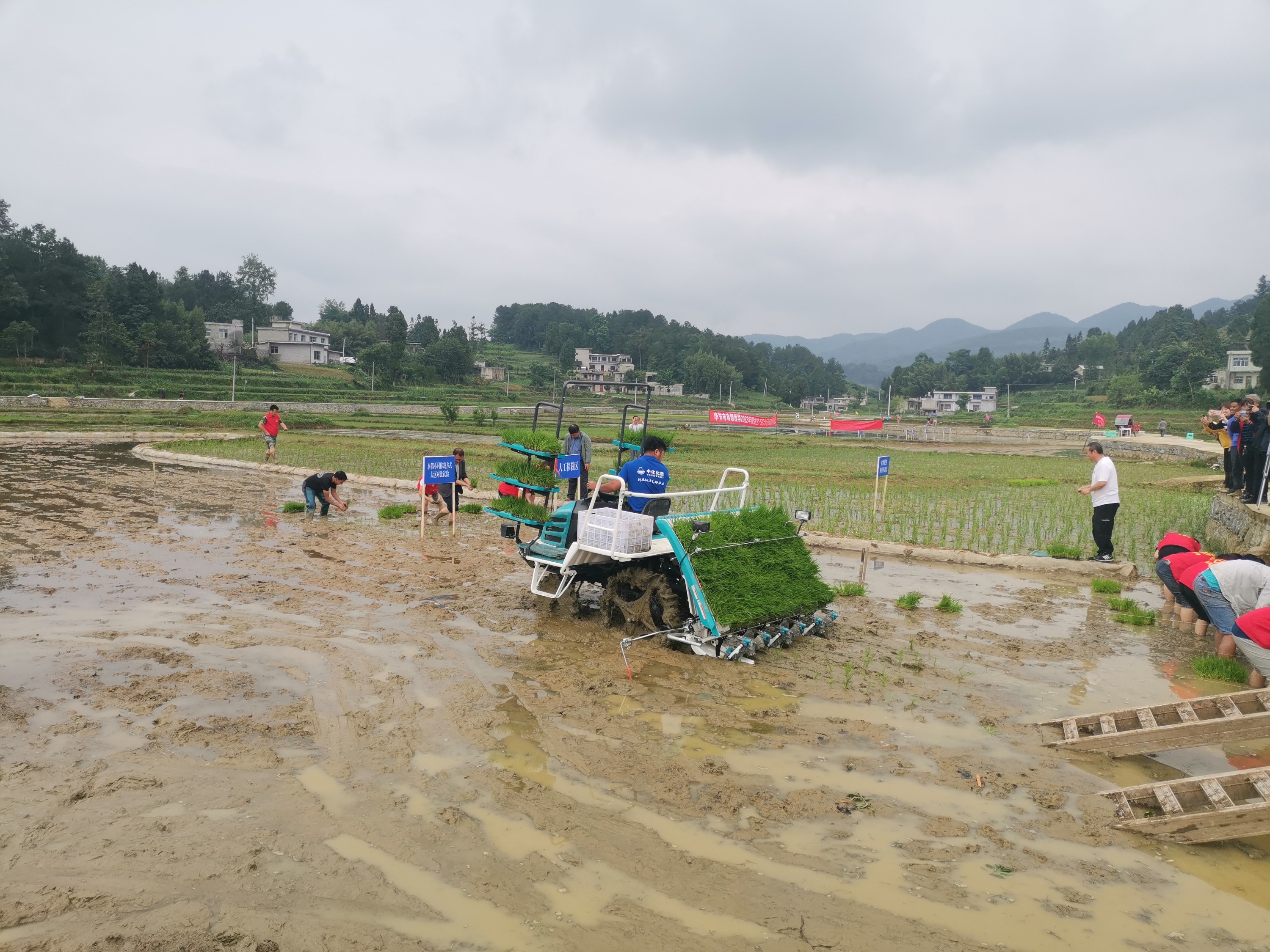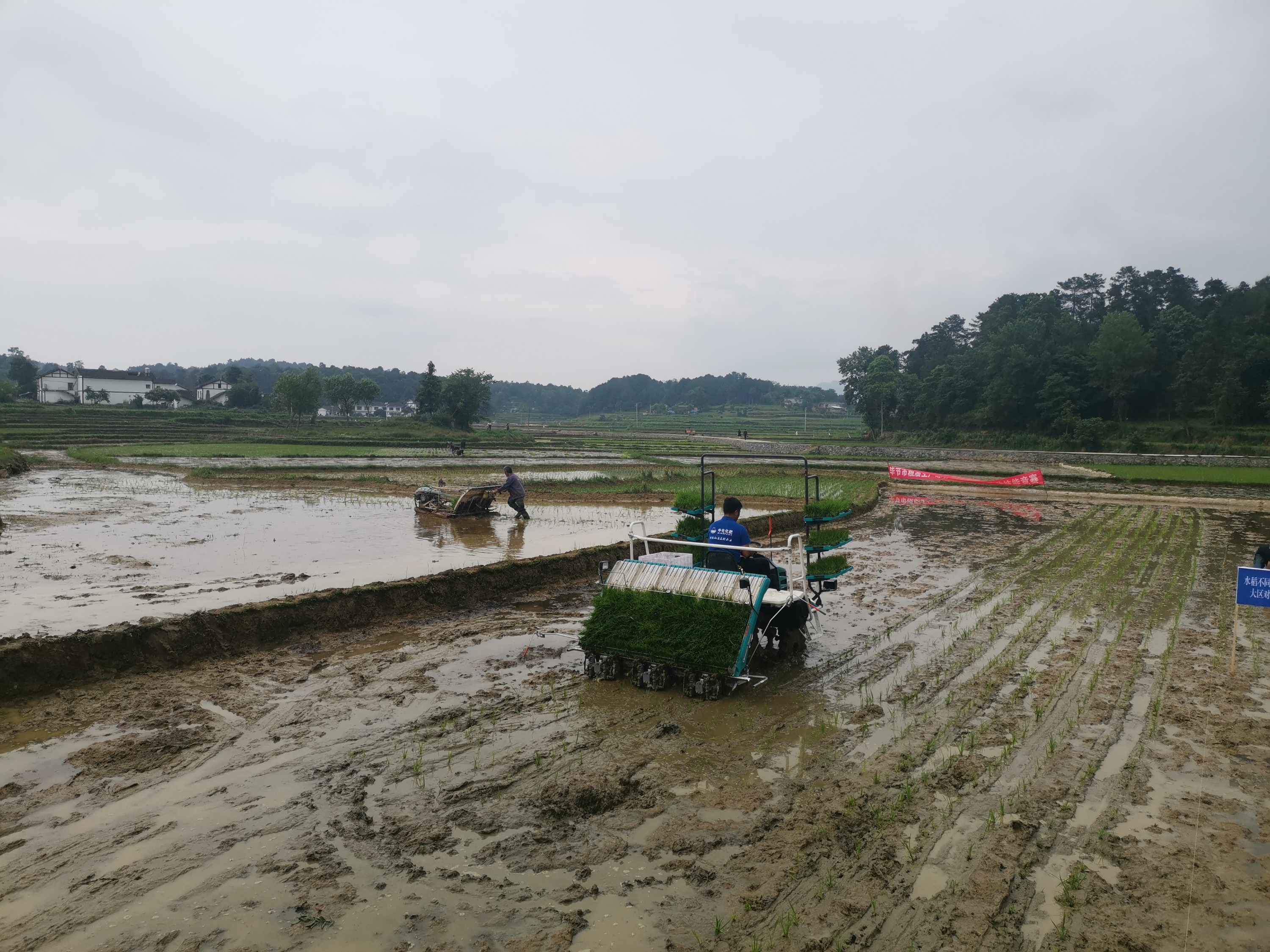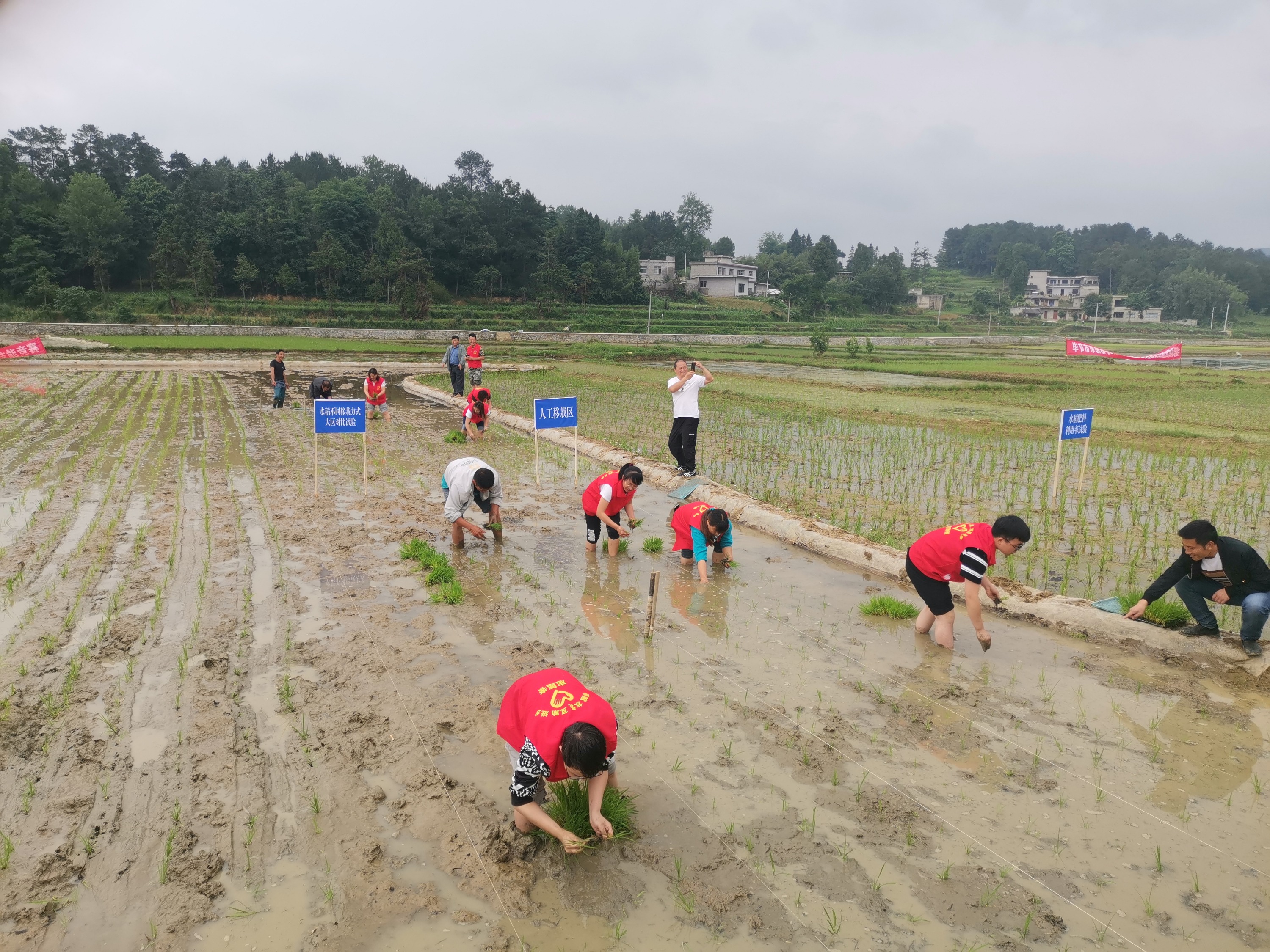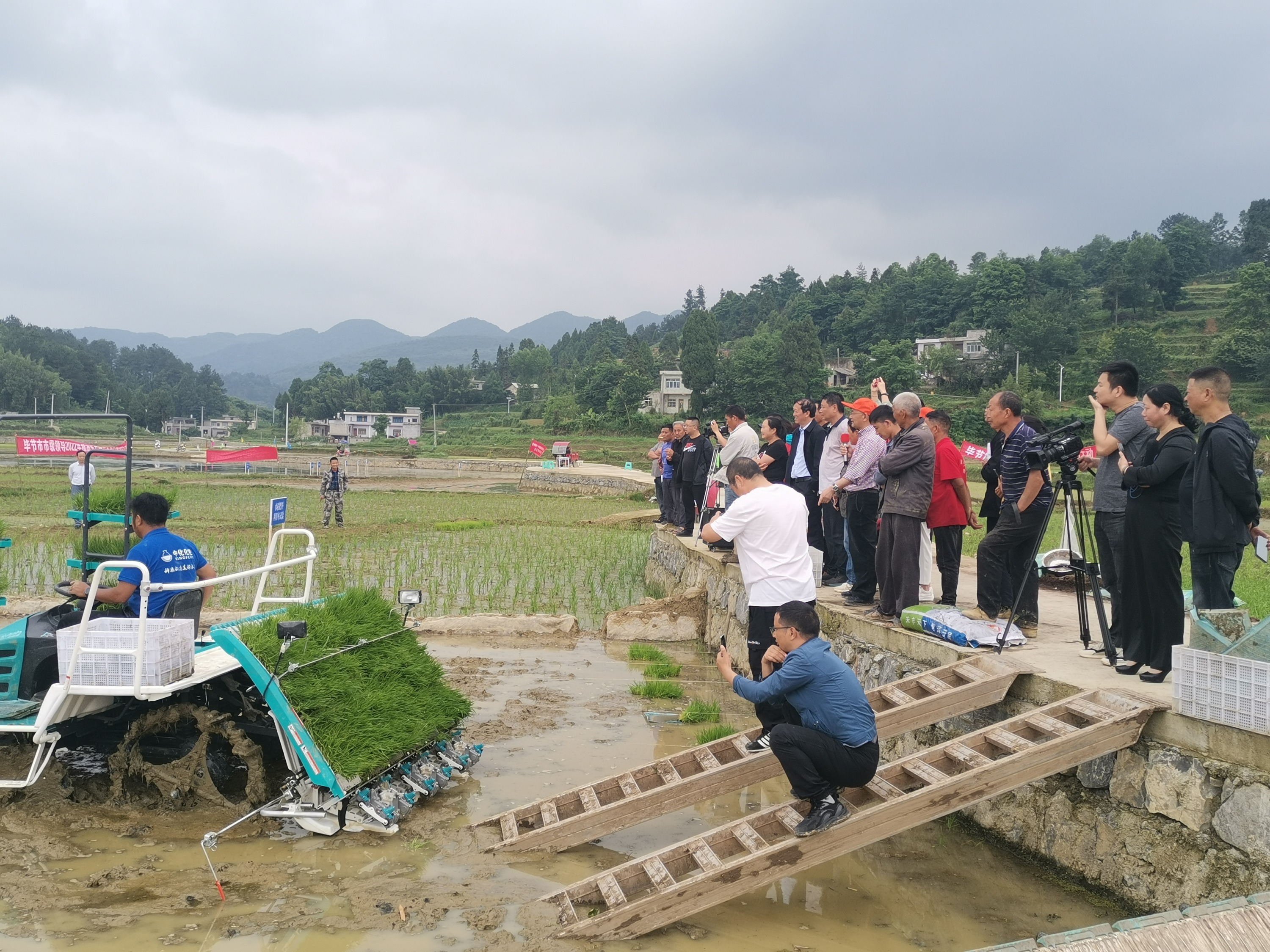 在金沙县禹谟镇大龙村水稻移栽现场,来自市、县的农机服务人员组织开展的机械化插秧和人工插秧形对比示范,结果表明,在同一时间内,机械化插秧与人工插秧的速度到80:1,亩栽种的秧苗数达到3:2的对比示范效果。