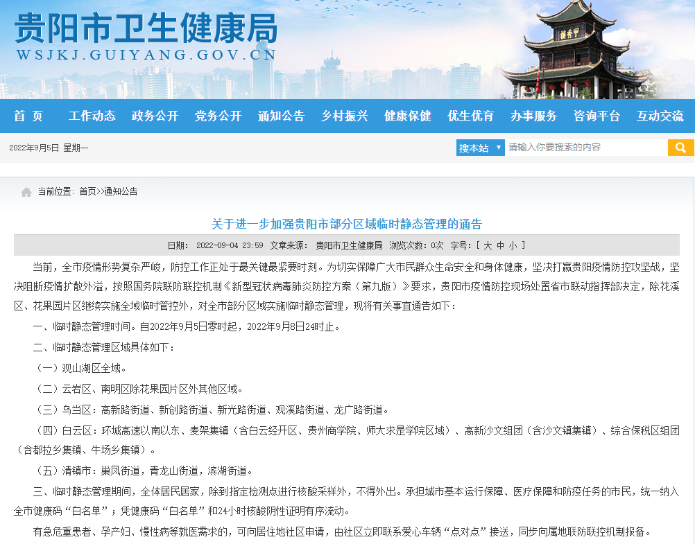 当前,全市疫情形势复杂严峻,防控工作正处于最关键最紧要时刻。为切实保障广大市民群众生命安全和身体健康,坚决打赢贵阳疫情防控攻坚战,坚决阻断疫情扩散外溢,按照国务院联防联控机制《新型冠状病毒肺炎防控方案(第九版)》要求,贵阳市疫情防控现场处置省市联动指挥部决定,除花溪区、花果园片区继续实施全域临时管控外,对全市部分区域实施临时静态管理,现将有关事宜通告如下: