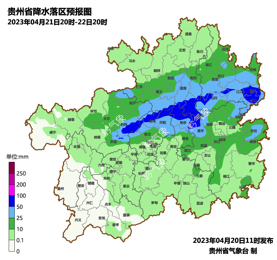 今天午后到夜间,西南部多云,其余地区阴天间多云有阵雨或雷雨,中西部和北部局地有中到大雨,个别乡镇暴雨,毕节市中东部、遵义市南部、六盘水市北部和东部、安顺市、贵阳市西部和北部、黔西南州北部和东部、黔南州西部局地在雷雨中伴有冰雹、短时强降水等强对流天气;