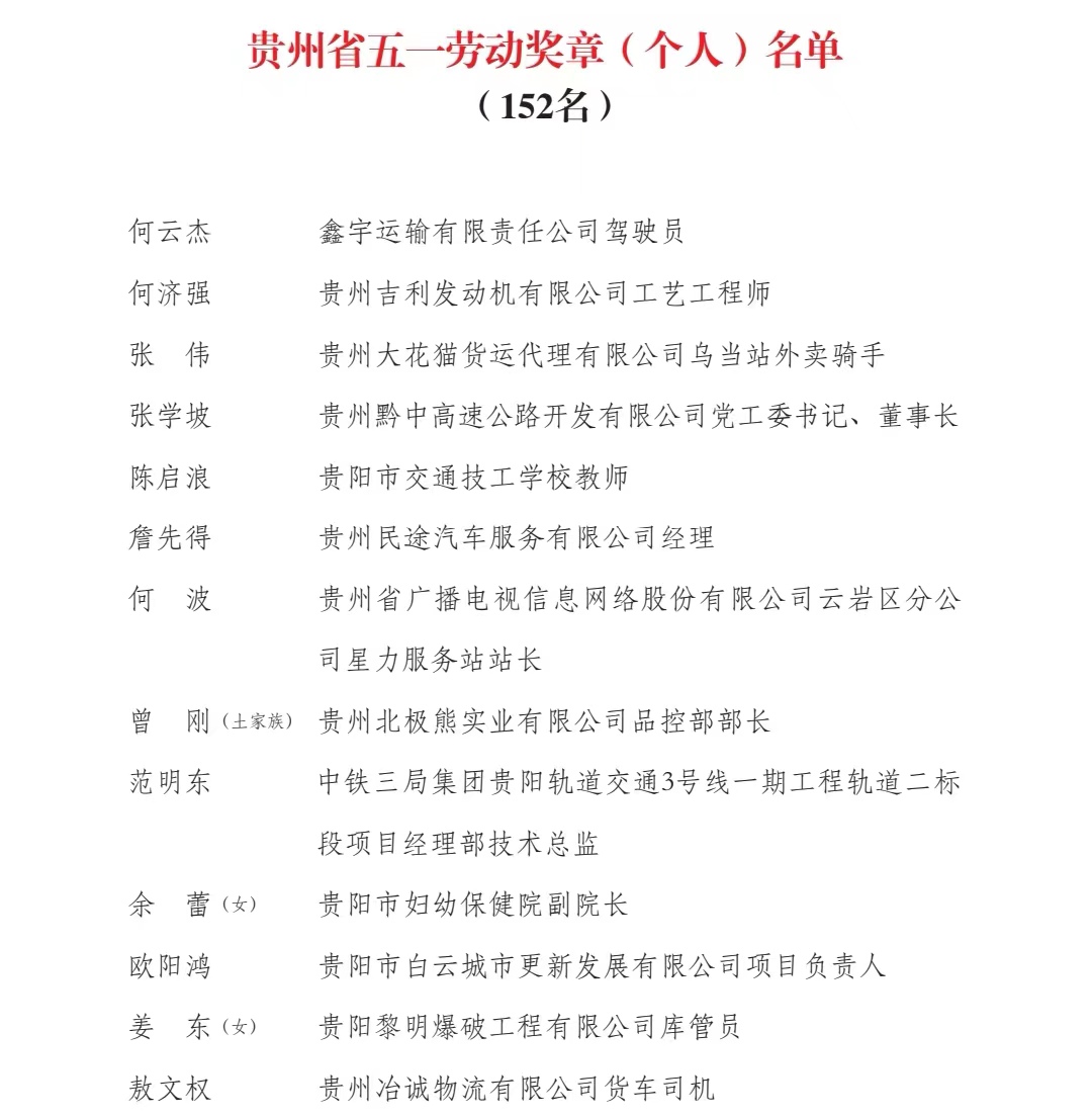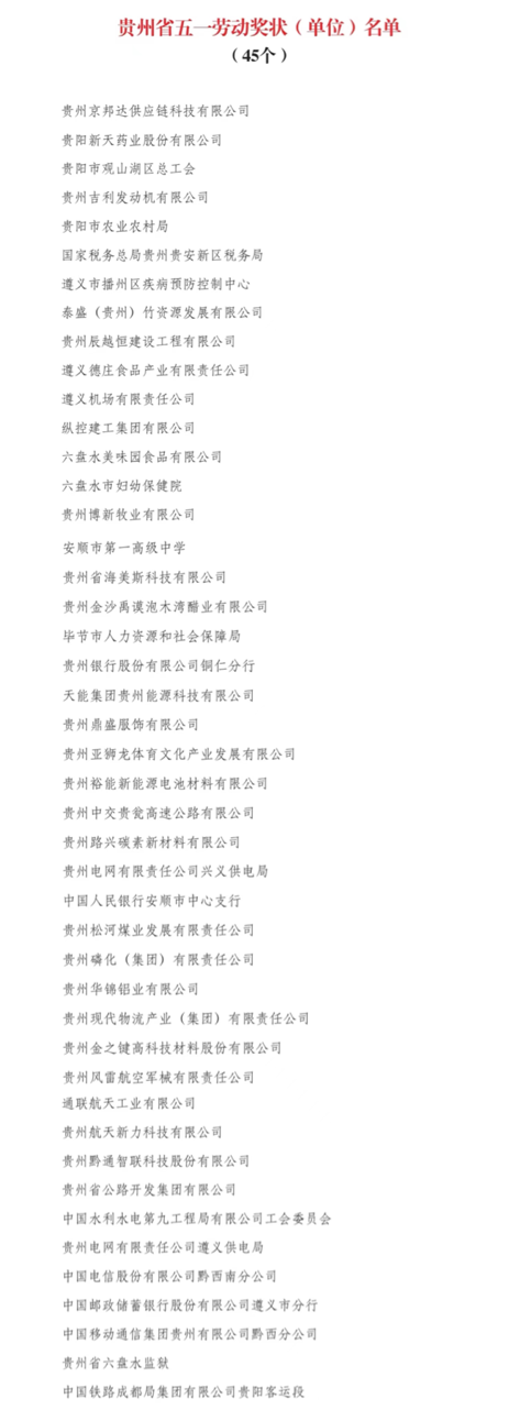 大会授予了贵州京邦达供应链科技有限公司等45个单位贵州省五一劳动奖状,授予何云杰等152名职工贵州省五一劳动奖章,授予贵州泰邦生物制品有限公司血液制品生产车间等118个集体贵州省工人先锋号。