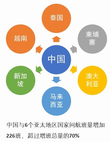 中国与泰国、柬埔寨、澳大利亚、马来西亚、新加坡、越南等6个亚太地区国家间的航班量共增加226班,超过增班总量的70%。