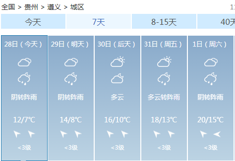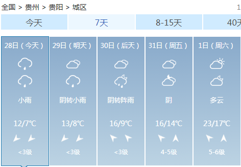 今天夜间到明天白天,贵州省阴天有阵雨或雷雨,南部局地有中雨;