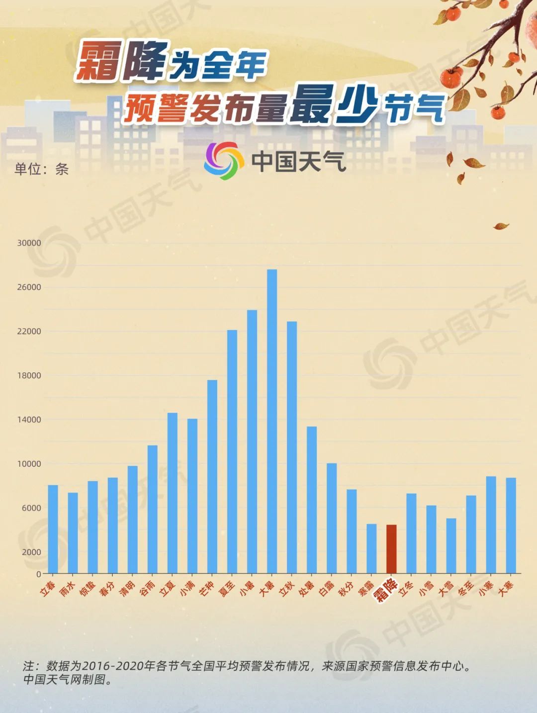来自国家预警信息发布中心2016-2020年的预警大数据显示,霜降为全年24个节气中平均预警发布量最少的节气。
