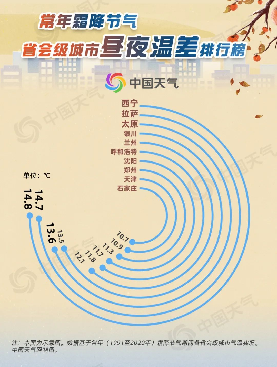 霜降节气我国大部地区昼夜温差进一步增大。1991-2020年的气象大数据显示,霜降是秋冬两季里昼夜温差最大的节气。从省会级城市昼夜温差排行榜来看,前十名几乎都是北方城市。西宁凭借14.8℃排名第一,拉萨以0.1℃之差屈居第二,太原排名第三。