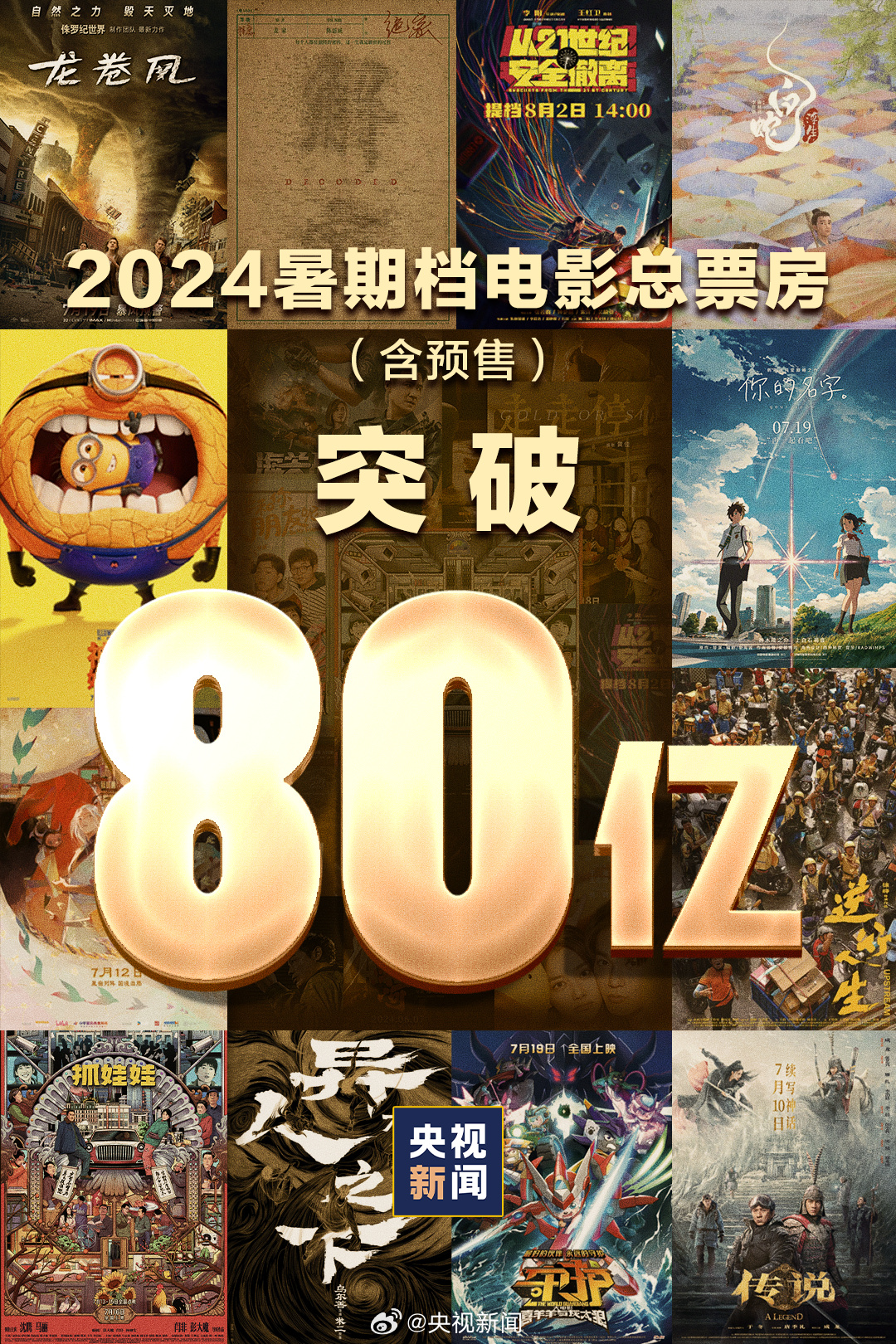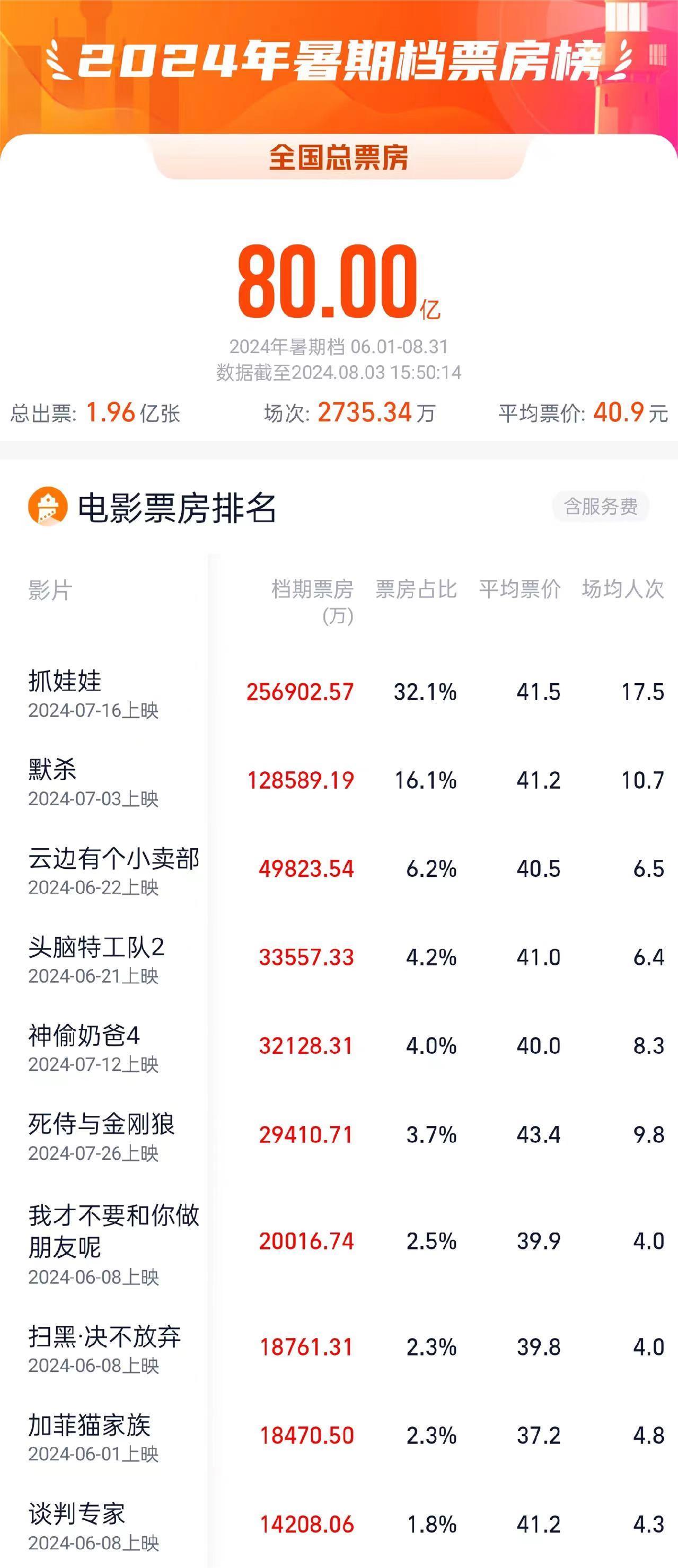 据网络平台实时数据,截至8月3日15时50分,2024年暑期档(6月—8月)档期电影总票房(含预售)突破80亿!
