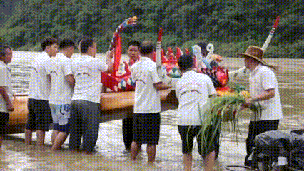 平时龙头放在“鼓头”家,舟身放在特制的“龙舟棚”里,用时将它们分别抬到河里组合成龙舟。