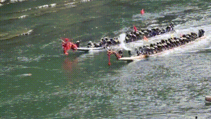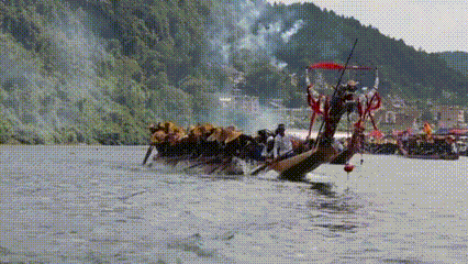 划龙舟时,由身穿古礼服的“鼓头”端坐船头击鼓。36个身着统一民族新装,头戴马尾丝编制、后缀燕尾银片斗笠的桡手,口唱飞歌,轮桨点水,龙舟竞渡。
