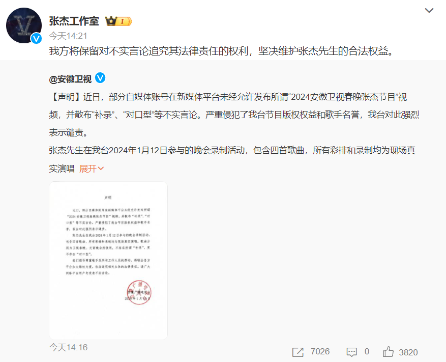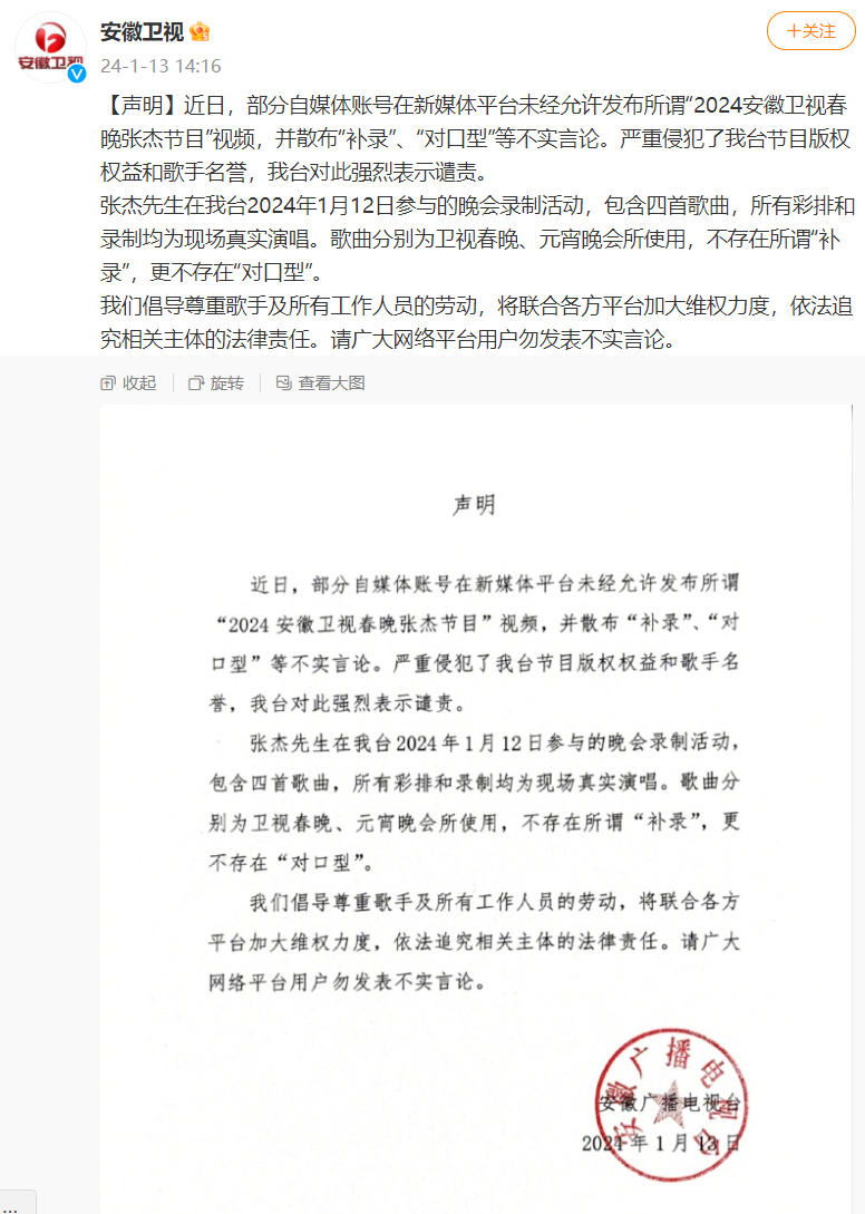 1月13日,安徽卫视就部分自媒体账号发布所谓“张杰对口型”等不实言论发表声明,全文如下: