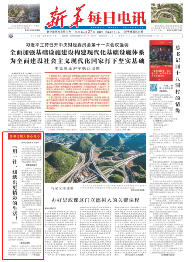 “很好!你也是不忘初心啊!苗绣既是传统的也是时尚的,你们一针一线绣出来,何其精彩!”习近平总书记勉励大家,一定要把苗绣发扬光大,这既是产业也是文化,发展好了既能弘扬民族文化、传统文化,同时也能为产业扶贫、为乡村振兴作出贡献。