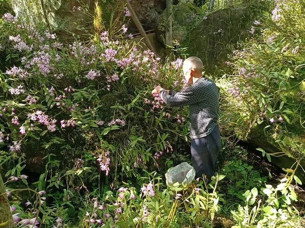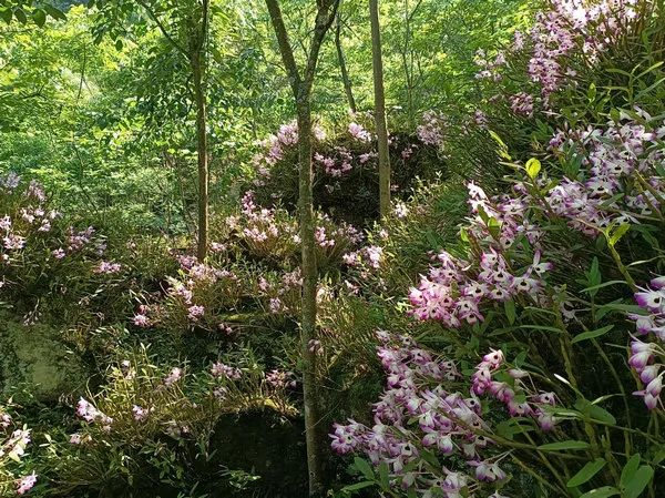 走进贵州省赤水市旺隆镇红花村金钗石斛示范基地,放眼望去,绿荫下的石头上开满了紫色的金钗石斛花,数十名村民正在石头上采收石斛花,还有不少游客在花丛中拍照、赏花,形成一幅美丽画卷。