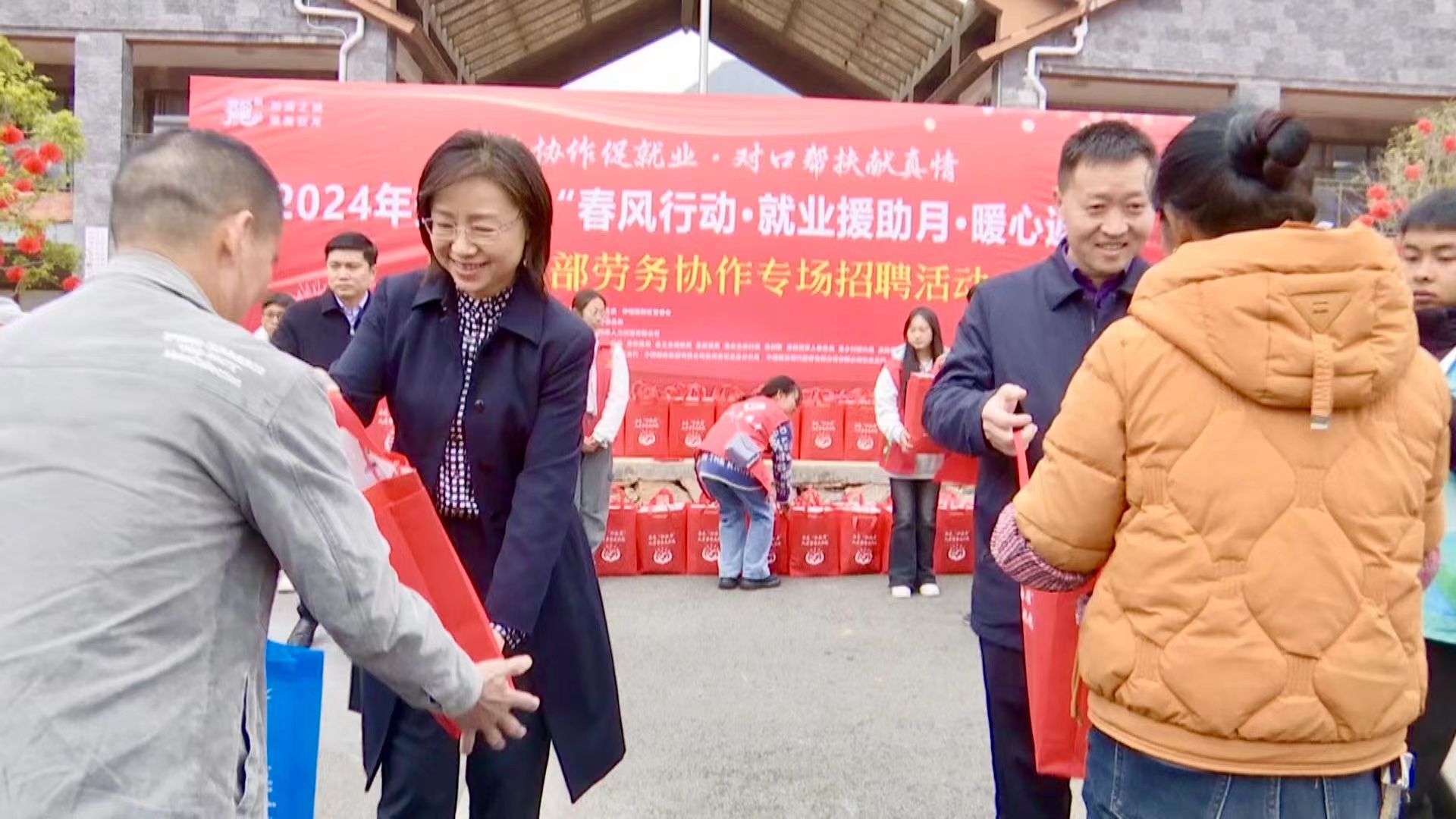 活动中,出席活动的州、县领导向返岗劳动力代表发放返岗“大礼包”。
