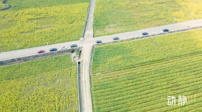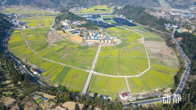 盛开的油菜花和青山、乡村民居、产业路交相辉映,构成一幅春意盎然的田园画卷。