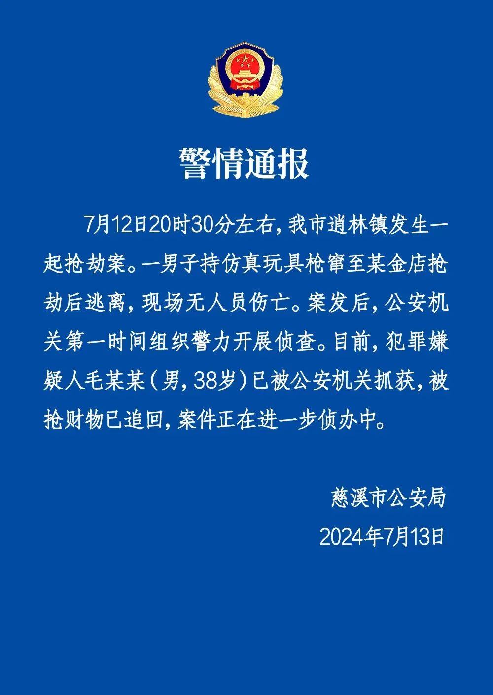 7月12日20时30分左右,慈溪市逍林镇发生一起抢劫案。一男子持仿真玩具枪窜至某金店抢劫后逃离,现场无人员伤亡。
