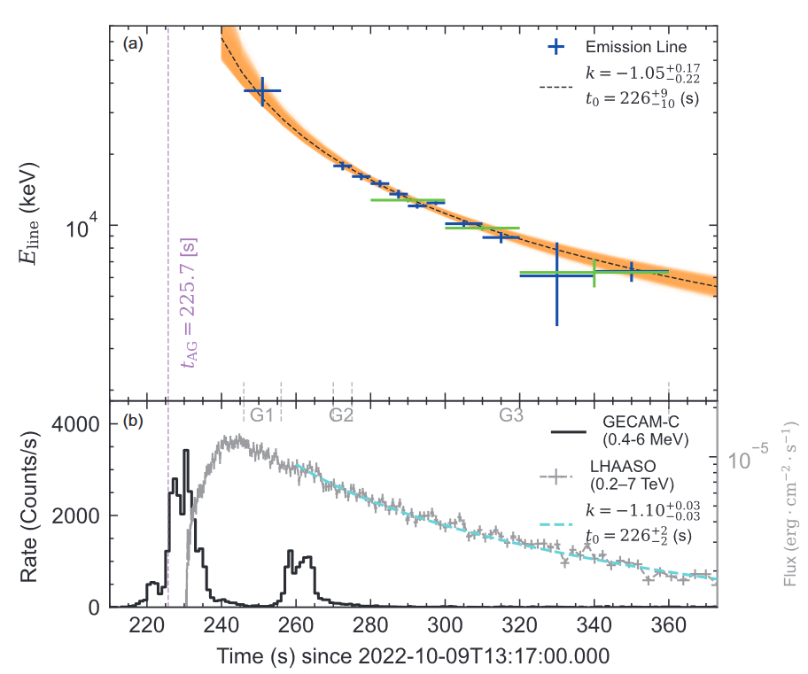 经过严谨分析,研究团队发现该伽马暴的能谱中存在一条演化规律的发射线谱线,谱线的能量和光度均随时间以幂律演化,为谱线的真实性以及谱线起源于该伽马暴提供了最坚实的证据。此外,研究团队还发现谱线的相对展宽较窄(仅10%左右)且基本不随时间变化。令人更意外的是,在伽马暴主暴阶段谱线能量高达37兆电子伏特,这是迄今探测到的宇宙天体产生的最高能量的谱线。这些发现对于研究伽马暴及相对论性喷流的物理性质和产生机制具有重要而独特价值,是伽马暴和极端宇宙观测研究的重大突破。