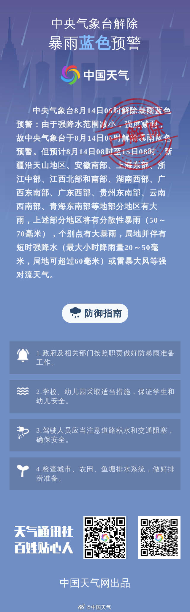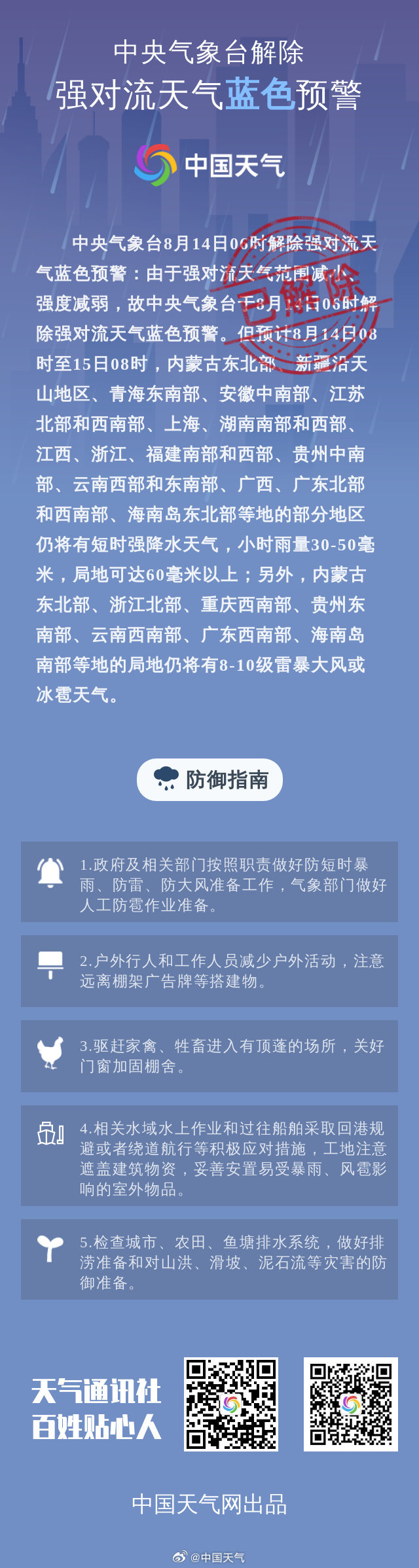 中央气象台8月14日06时解除强对流天气蓝色预警