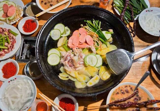 西部名小吃!香辣爽口,味道奇香。食用蔬菜(如莲花白、芹菜等)适量,肉类(猪肉、牛肉、鱼肉等)适量,土豆、臭豆腐、碱豆腐、魔芋豆腐,肥肠,鸡翅等都可以成为烙锅的食材,再配上当地特色辣椒面,味道简直一绝!