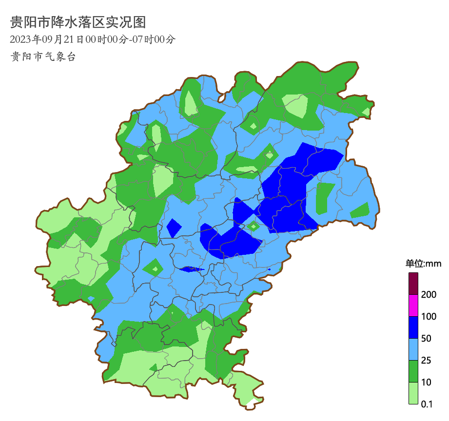 据贵阳市气象台监测,21日00时到早晨7时,贵阳贵安共出现27站暴雨,其中乌当区11站、白云区6站、开阳县5站、修文县3站、观山湖区1站、云岩区1站。最大雨量出现在开阳县长官司,雨量为80.1毫米。最大小时雨强为云岩区偏坡40.4毫米每小时。期间,贵阳贵安还出现77站大雨、52站中雨、39站小雨。