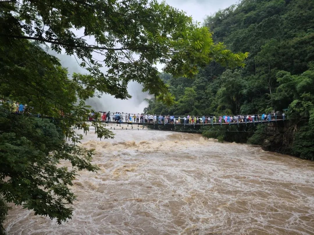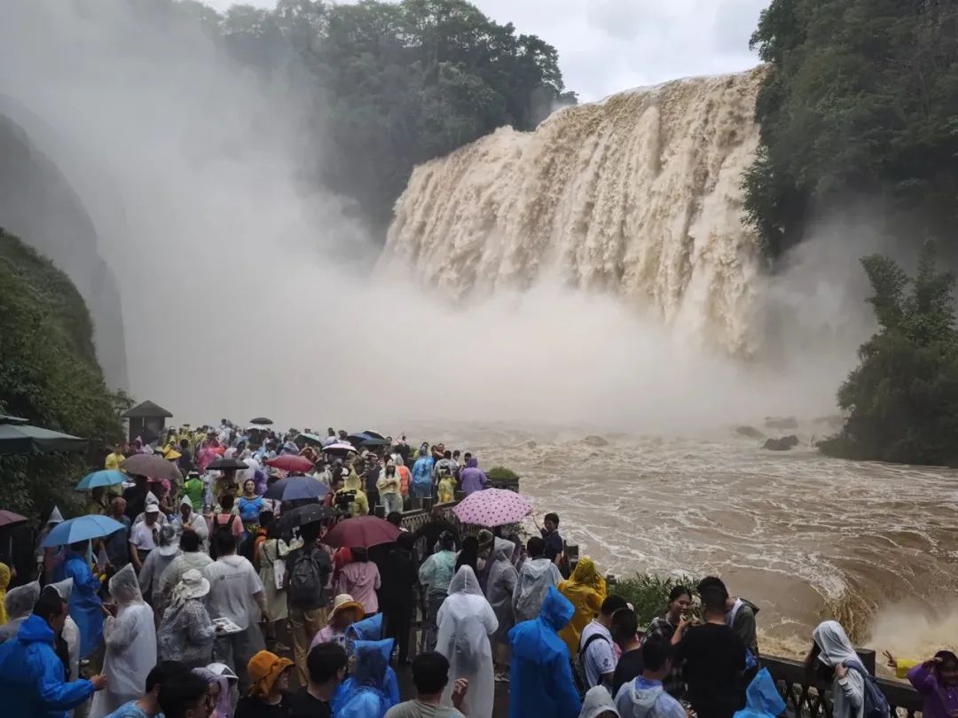 安顺黄果树瀑布景区,由于连日来受降雨天气影响,水位持续上升,黄果树瀑布迎来今年最大水量,气势磅礴的瀑布倾斜而下,场面十分壮观,吸引了全国各地游客前来避暑。据了解,每天开园前就已经有不少游客在排队等候,火爆场面可见一斑。