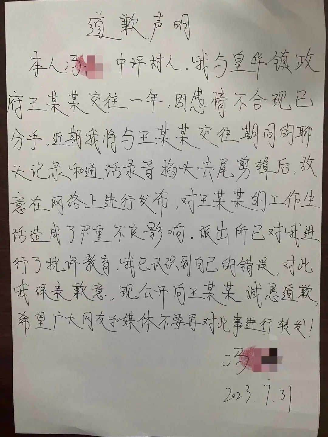 当日晚上,一男子在网上发布道歉声明,称自己与皇华镇政府王某某交往一年,因感情不和现已分手。