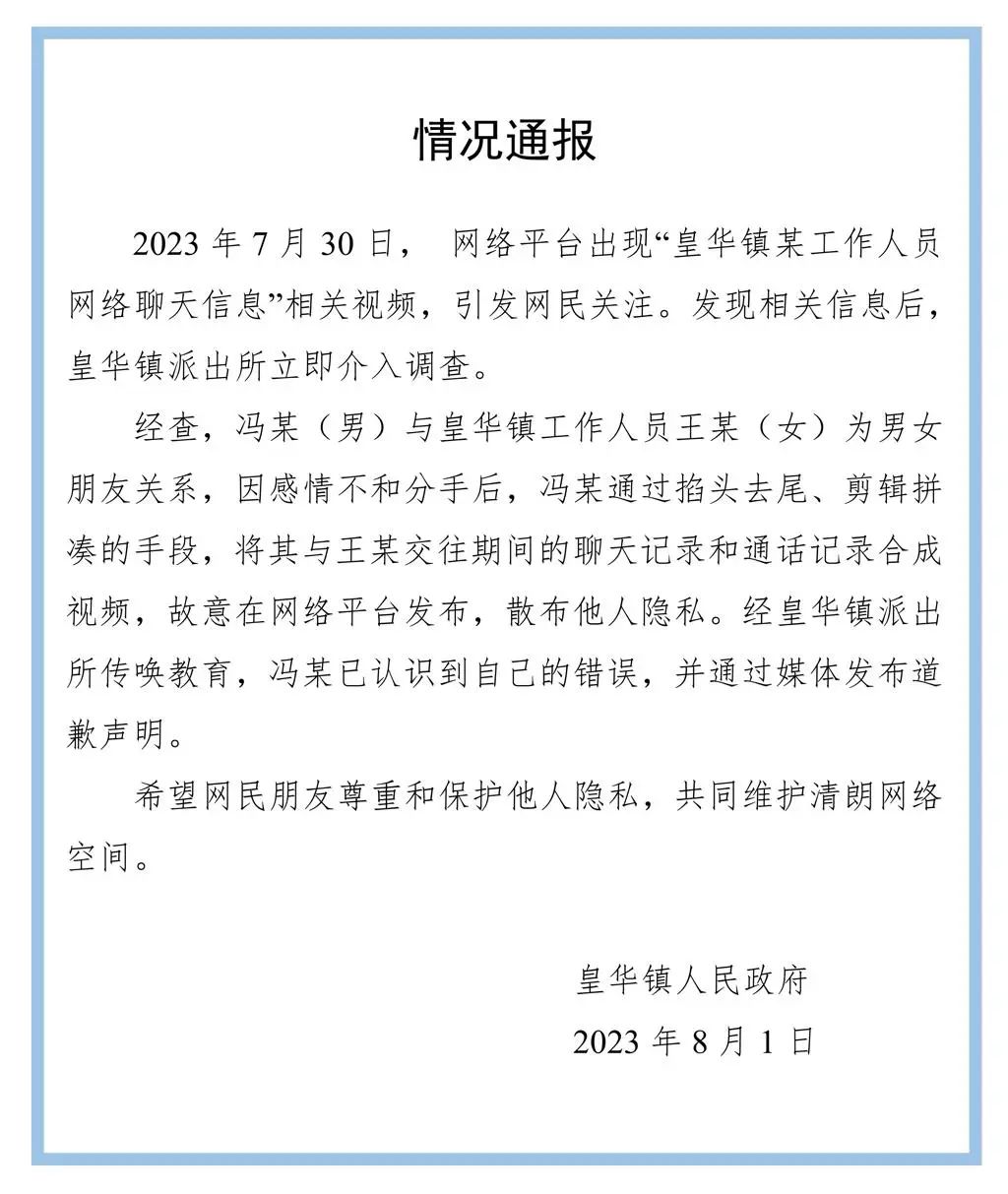 通报称,2023年7月30日,网络平台出现“皇华镇某工作人员网络聊天信息”相关视频,引发网民关注。发现相关信息后,皇华镇派出所立即介入调查。