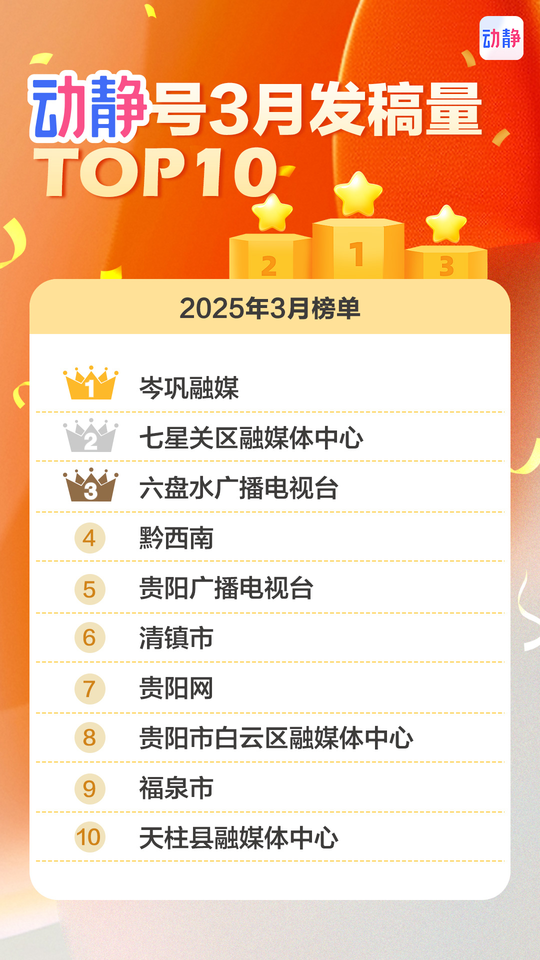 3月发稿数量TOP10的前三甲分别是岑巩融媒、七星关区融媒体中心、六盘水广播电视台,数据显示,这3家发稿量都超过了300条,日均10条以上,妥妥的上稿王。